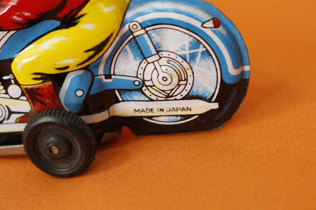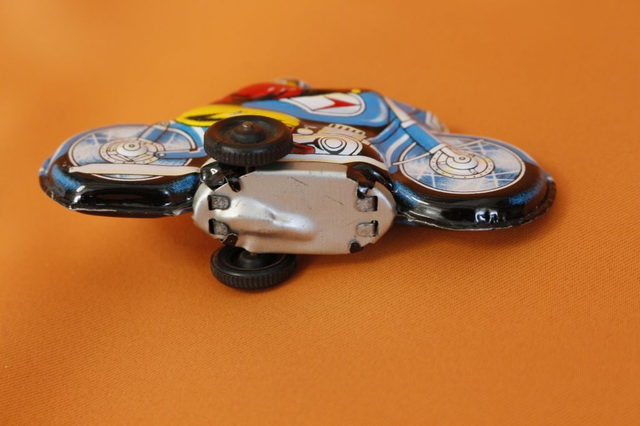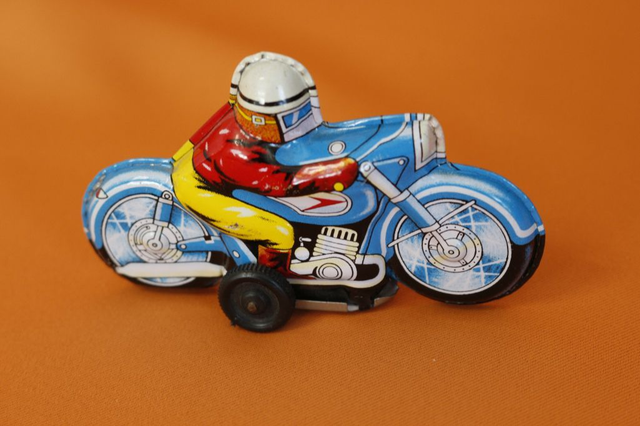Ich verkaufe hier ein schönes, sehr gut funktionierendes Blechspielzeug, ein Motorrad mit Friktionsantrieb in sehr gutem Zustand, nur leichte Gebrauchsspuren. Der Antrieb funktioniert auch noch sehr gut! "Made in Japan" ca. 10,5 cm lang und 6cm hoch