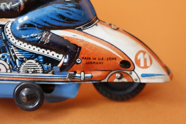 Ich verkaufe hier ein sehr altes Blechspielzeug der Marke HUKI Kienberger. Das Motorrad (es verfügt über keinen Antrieb) ist nur wenig bespielt und in gutem Schuss. Es ist "Made in U.S.-Zone Germany" also wurde es irgendwo zwischen 1945 und 1950 produziert.