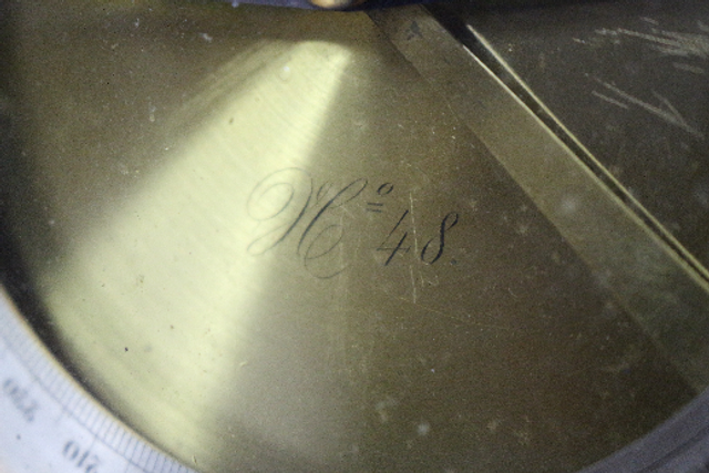 Die Bussole ist aus Messing mit vermutlich versilberter Skala, rechts unten ein Feststellrad, mit dem man die Nadel fixieren kann.