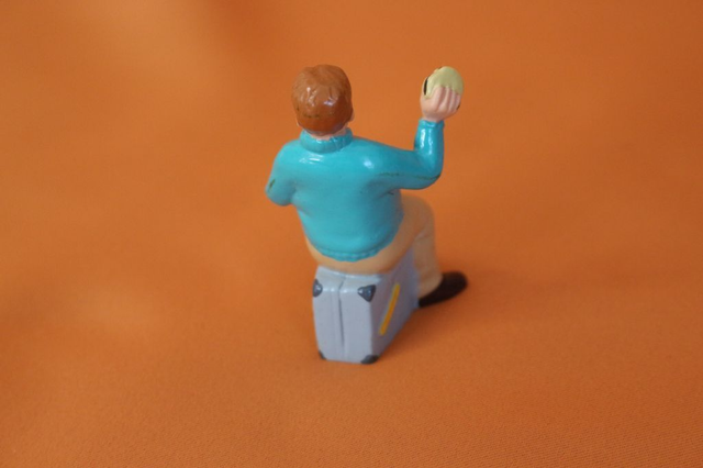 Ich verkaufe hier eine Figur für eine Modelleisenbahn in Spur G von der Firma Noch. Einen auf dem Koffer sitzenden Mann mit Burger.