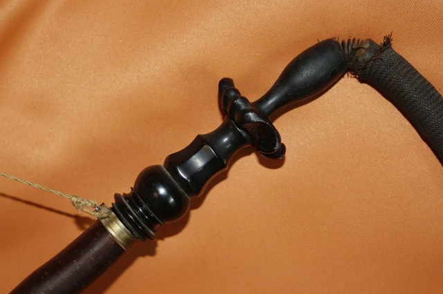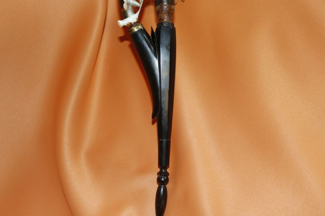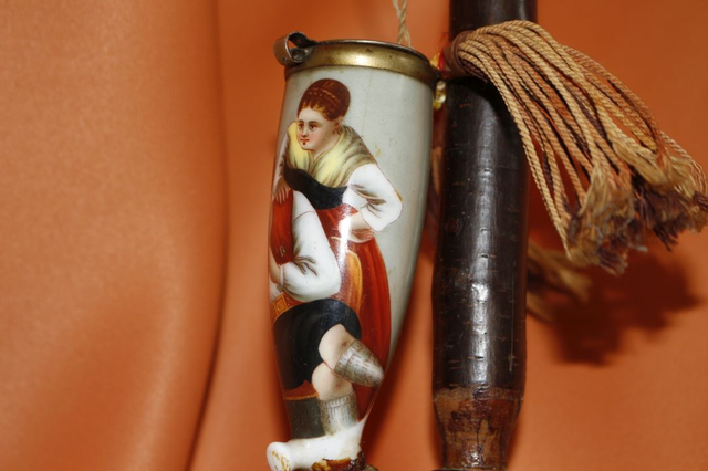 Ich verkaufe hier eine schöne, sehr alte, wohl antike Stielpfeife, Tabakpfeife mit Keramikkopf und schönem ländlichen Motiv.
