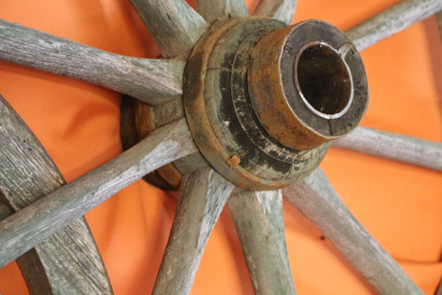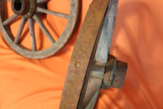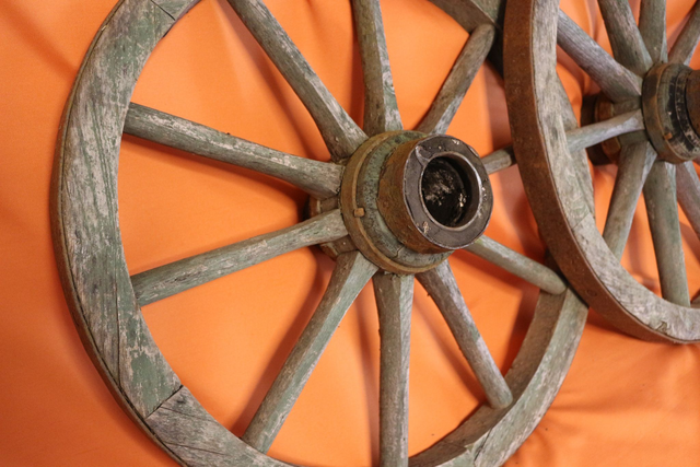 Ich verkaufe hier 2 alte Kutschenräder mit einem Durchmesser von ca 56cm, die Lauffläche ist ca. 4cm breit. Die Räder sind vermutlich einmal grünlich gewesen (wie angeblich die ganze Kutsche) an den Radnaben kann man noch handgeschmiedete Nägel erkennen.