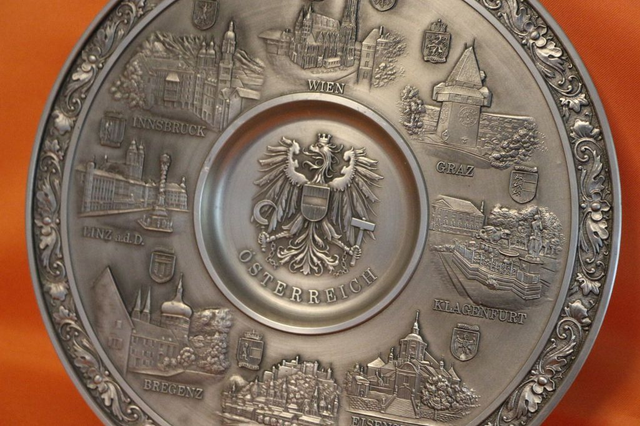 Ich verkaufe hier ein Zinnteller der Firma Becker mit österreichischem Adler in der Mitte und die Bundesländer rundherum. 22,5cm Durchmesser und ca. 480 Gramm